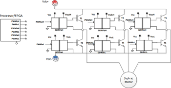 PWM signals, such as PWMaH and PWMaL, are generated within the motor controller, generally implemented in a processor and/or FPGA. These signals are generally low voltage signals referenced to the processor ground rail. In order to turn on and turn off the power transistors correctly, the logic level signals must be amplified in voltage level and current source capability. They must also be level shifted so that they are ground referenced to the relevant power transistor emitter. Depending on the processor location within the system, they may also require safety level insulation.