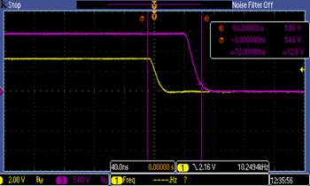 The gate driver turn off timing is illustrated from the motor control application in Figure 8 where the turn off command from the processor is shown followed by the IGBT gate emitter signal. The total delay from commencement of the turn off signal to the point where the IGBT gate drive signal is near zero is only 72 ns.