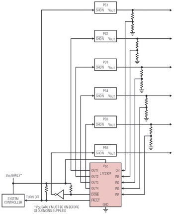 Four power supplies can be easily sequenced using a single LTC2924, and multiple LTC2924s can be just as easily cascaded to sequence any number of power supplies. With slightly reduced functionality, six power supplies can be sequenced with a single LTC2924 (see Figure 5 and “Sequencing Six Supplies with a Single LTC2924” in this article).