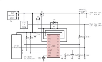 The LTC2924 fits into a wide variety of power supply sequencing and monitoring applications. With very few external components and a 16-pin narrow SSOP, an LTC2924 based sequencing solution requires very little board space.