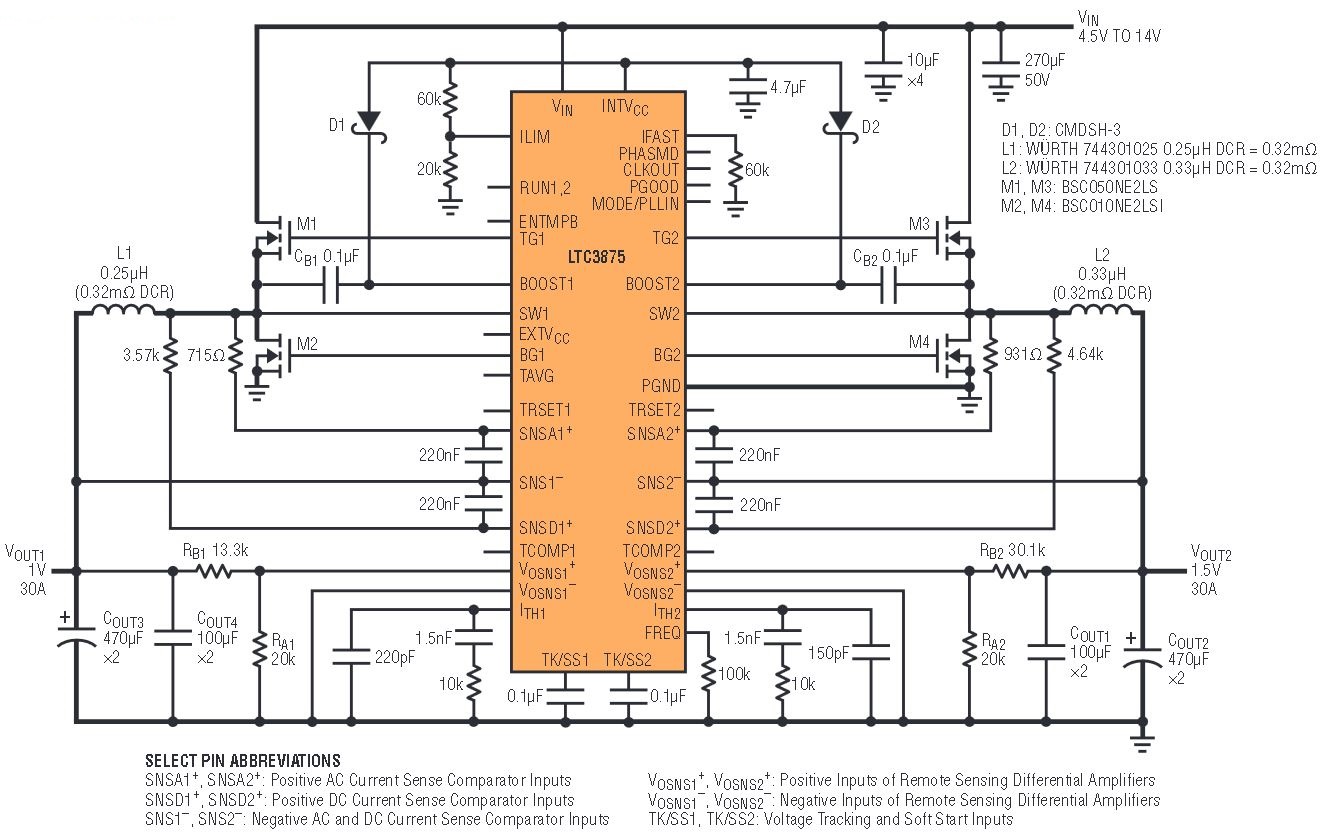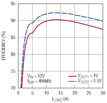 Figure 1. A dual-output converter (1.0V at 30A and 1.5V at 30A) featuring the LTC3875.