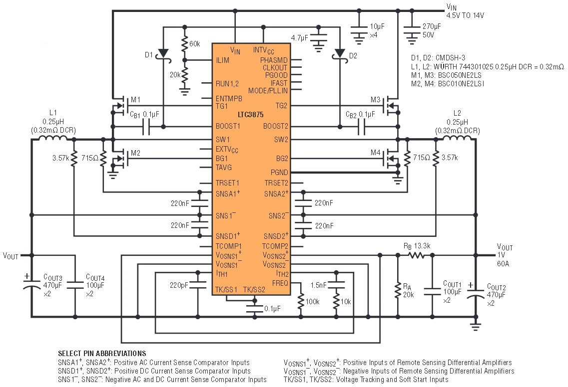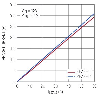 The LTC3875 can be easily configured as a dual-phase single-output converter for higher current solutions. Figure 5 shows a buck converter that produces a 1V, 60A output from a 12V input. Multiple ICs can be paralleled and phase-interleaved for even higher current if required.