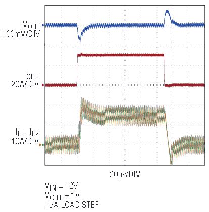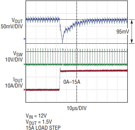 Figure 4 shows that switching cycle delay is reduced from 2.18μs to 1.2μs and voltage undershoot is reduced from 95mV to 67.5mV (29% reduction) at 15A load up after the fast transient is enabled. In other words, with fast transient enabled, the LTC3875 can achieve the same transient performance as without, but with 20% less output capacitance, increasing power density and reducing total cost. Compared to other nonlinear control methods, the response scheme used by the LTC3875 is linear, simplifying overall design.
