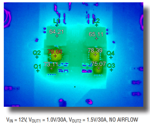 Efficiency can be optimized with ultralow DCR inductor. As shown in Figure 2, the total solution efficiency in forced continuous mode (CCM) is 87.3% at 1.0V/30A output, and 89.8% at 1.5V/30A. The hot spot (bottom MOSFET) temperature rise is 57°C without any airflow as shown in Figure 3, where the ambient temperature is about 23°C.