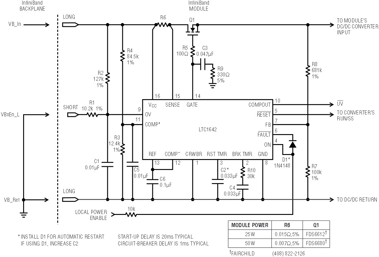 R6 senses Q1’s drain current. When its voltage drop reaches a limiting value, a control loop in the LTC1642 servos Q1’s gate voltage to prevent further increases in drain current. The loop regulates in 5µs to 10µs after activation, safely within the 20µs specification. R9 works with C3 to compensate this loop. Q1’s maximum allowed drain current increases as its source voltage, sensed by the R7–R8 divider, increases. The voltage across R6 is limited to 23mV when the LTC1642’s FB pin is grounded, increasing gradually to 53mV when FB is 1V or more. This “foldback” current limiting tends to equalize Q1’s power dissipation during “hard” and “soft” shorts. If Q1 remains in current limit too long, it is latched off to keep it from overheating, and the FAULT output is asserted. The delay before latch-off is 1ms, proportional to C4. R10 is included to ensure that Q1 eventually latches off after repetitive, transient current limiting individually lasting less than 1ms. Optional diode D1 is particularly useful on modules lacking an InfiniBand Management Device; it automatically restarts the LTC1642 if it should latch off. Increase C2 if using it, to increase Q1’s off time and keep it from overheating during repeated start-up cycles. To restart the circuit if D1 is omitted, either an InfiniBand Management Device must detect the fault and toggle Local Power Enable or the bulk power to the module must be cycled off then on.