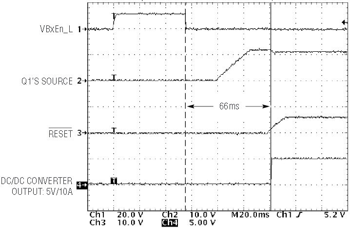 The circuit was tested with a 50W DC/DC converter, LTC Demo Board DC222 (demo boards are available to qualified customers—contact LTC Marketing for information). Figure 2 shows an oscillograph captured during module plug-in. The delay from VbxEn_L assertion to the converter’s output coming into regulation is 66ms, safely within the 500ms InfiniBand specification.