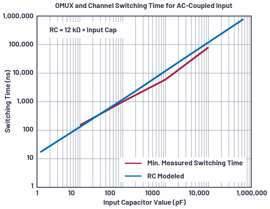 Figure 4. Plot of OMUX and channel switching time due to AC-coupled input. RB = 12 kΩ.