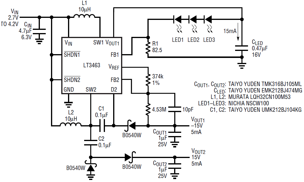 A typical LCD application requires both a positive and a negative voltage to drive the glass and, in some cases, a means of illuminating the back panel. The LT3463 circuit shown in Figure 1 provides all three. The outputs of this circuit are 15V, –15V and a 15mA LED driver. The –15V rail is generated from an inverting charge pump regulated by channel 2 of the LT3463. A quasi-regulated charge pump tapped from the switch node of channel 2 forms the 15V rail. Channel 1 is configured as current source boost converter and supplies current to the LEDs. The advantages offered by this circuit are low quiescent current and minimal parts count.
