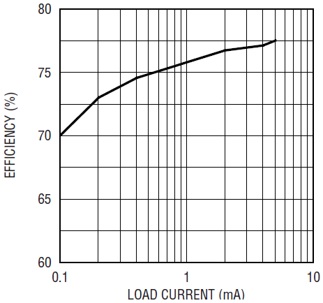 The on-demand power delivery provided by the Burst Mode operation of the LT3463 allows the ±15V rails to have a no-load quiescent current of 76µA and an efficiency of over 73% from 5% load to 100% load for an input voltage of 3.6V. The full load efficiency is 77% at 3.6V. (See Figure 2.) Because a charge pump is used for both the positive and negative output, the load is disconnected from the output during shutdown which increases battery run time. The slave charge pump for the +15V rail does require more parts than a slave boost converter, but the extra parts are offset by the internal Schottky diodes of the LT3463.