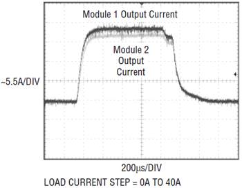 Figure 4 shows the pulsed load current waveforms of two paralleled power supplies with load sharing. The waveform shows that the two supplies have good current sharing from no load to heavy load, 40A. Figure 5 shows the hot swapping waveforms of two paralleled modules with a total of 40A output current. The settling time for load transients and hot swap load currents can be adjusted via the compensation resistors and capacitors on the COMP1 and COMP2 pins of the LTC4350. See the LTC4350 data sheet for details.