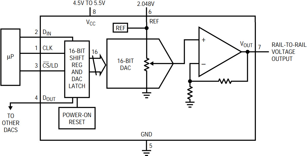 A typical application for the LTC1655 is shown in Figure 3. The LTC1655 has the same interface as the LTC1658 and is also capable of being daisy chained. There is an onboard 2.048V bandgap reference connected internally to the 16-bit DAC. The rail-to-rail output nominally swings from 0V to 4.096V, since there is a gain of two in the output amplifier. The reference pin can be overdriven to a value higher than 2.048V if a larger output swing is desired. Since there is a gain of 2 from the reference pin to the output at full-scale, the voltage on the REF pin must always be less than VCC /2. Figure 4 plots the typical DNL of the LTC1655.
