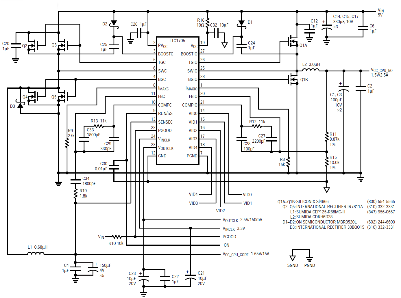 The LTC1705 uses a constant 550kHz switching frequency that allows the use of physically small inductors. The LTC1705 includes two switching regulator controllers, one for the CPU core and one for the I/O, each designed to drive a pair of N-channel MOSFETs in a voltage-mode feedback, synchronous buck configuration. An onboard 5-bit DAC sets the core output voltage according to the Intel mobile VID specification. The IC also includes a low dropout linear regulator (LDO) that delivers more than 150mA of output current for the CLK supply. The LTC1705 also has an open-drain PGOOD pin that indicates when all three outputs are within ±10% of their regulated values.