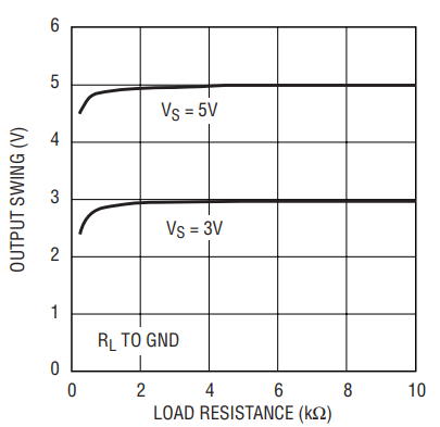 Figure 3. LTC2050 output voltage swing vs load resistance.