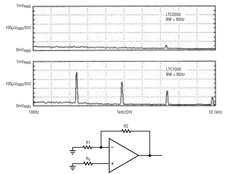 The first source is caused by the settling of the internal sampling capacitor and is input referred; that is, it is multiplied by the closed loop gain of the op amp. This form of clock feedthrough is independent of input source resistance or gain setting resistors. Figure 4 shows the spectrum of the LTC2050 with a closed loop gain of –100 with R2 = 100k, and R1 = RS = 1k. There is a residue clock feedthrough of less than 1µVRMS (input-referred) at 7.5kHz. This very low clock feedthough is achieved in the LTC2050 by internal circuitry that improves settling of the internal autozero storage capacitors. Also in Figure 4, the clock feedthrough of the LTC2050 is compared with that of the very popular LTC1050.