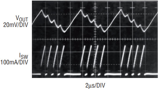 Figure 2. Output ripple of the 3.6V to −8V inverter at 15mA is 40mV.