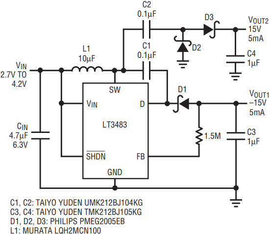 A typical LCD application requires both a positive and a negative voltage. The LT3483 circuit shown in Figure 3 provides a 15V and a −15V output from a 3.6V supply. The −15V rail is generated using an inverting charge pump and is regulated through the feedback resistor. The quasi-regulated 15V is generated by a charge pump tapped from the switch node.