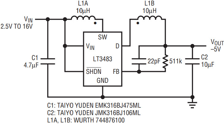 One of the strengths of the LT3483 is its versatility. It can be used for inverting step-up (boost) or for inverting step-down applications. It features an input range of 2.5V to 16V, so the device works well with a range of battery types and configurations. Its internal 40V switch and integrated 40V Schottky rectifier allow it to generate output voltages to ±38V.