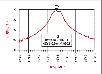 RF simulation software is now used to simulate the Toyocom FM filter using the filter's 2 port S-parameters and also use ideal component values to establish a point of reference(see Figure 3). Figure 4 shows the ideal frequency response. This point of reference gives the ideal performance. Once real inductors models are used, the performance will degrade due to the lower quality factor (Q) of the real inductors. Wire-wound inductors with High-Q values should be used in the practical implementation to reduce the insertion loss. The capacitors used in this application should be ceramic monolithic chip capacitors, since their Q is greater than 200 at 183.6MHz and will introduce minimal insertion loss.