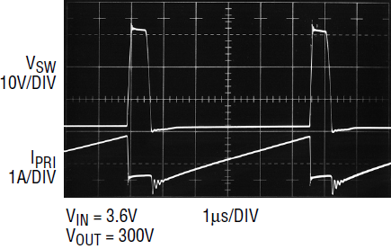Note that the flux in the flyback transformer is brought to zero on each switching cycle. This is generally referred to as boundary mode operation since the transformer is operated in between continuous conduction mode and discontinuous conduction mode (CCM and DCM respectively). When the CHARGE pin is forced low at any time, the LT3484/LT3485 ceases power delivery and goes into shutdown mode, thus reducing quiescent current to less than 1µA. Figure 6 shows some typical waveforms for the LT3484 and LT3485.