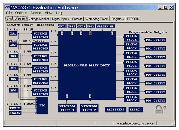 By simply pointing to a block of the interface and typing the appropriate value (input signal, timing, etc.) an engineer without software experience can easily configure the MAX6870. Once the setup is satisfactory, program the IC and ready it for the application by clicking the "Load to Memory" button. The MAX6870 is the first multi-input controller designed for complex system monitoring. Accurate and configurable, it simplifies the design of modern systems.