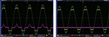 Figure 4. Yellow = ADC input, green = ADC driver input, purple = reference (ac coupled). Left image without Schottky diodes. Right image with Schottky diodes (BAT54S) added.