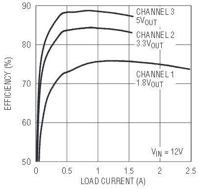 The LT3507 includes three independent, monolithic switching regulators to achieve a space saving solution. Channel 1 is capable of providing up to 2.4A of output current. Channels 2 and 3 are each capable of providing up to 1.6A of output current. Each of the three switching regulators has its own input supply pin to the power switch. The regulators may be operated from different supplies in order to maximize system efficiency.