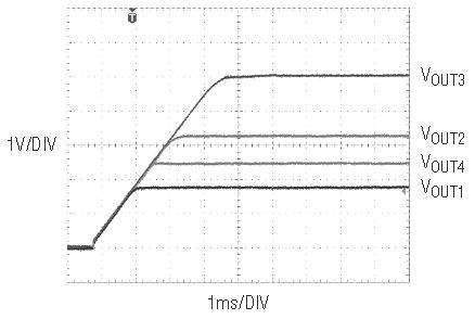 The outputs are set to coincident tracking using the 5V supply as the master. But wait, there’s no resistor divider on the TRK/SS4 pin! It’s no mistake; the LDO output coincidently tracks the supply it’s sourced from (the 3.3V supply in this case) as long as Q1 is a low VCESAT transistor, such as the NSS30101 used here. Just remember that this little cheat only works for coincident tracking. Figure 4 shows the start-up waveforms of the four outputs.