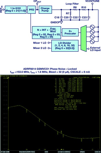 Low VCO phase noise is typically achieved with a high quality factor (high-Q) tank and narrow-band design. Frequency division can also reduce noise. By operating a VCO at an integer multiple of a receiver’s LO frequency, a 6 dB/octave reduction in phase noise is achieved by the subsequent division, which is displayed in Figure 3. The phase noise requirements for GSM in the 1800 MHz to 1900 MHz band are extremely difficult—roughly twice as severe as those in the 800 MHz to 900 MHz band.