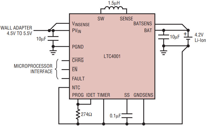 The LTC4001 sets a new standard for small, low parts count, full-featured, high efficiency Li-Ion battery chargers. Low power dissipation makes continuous 2A battery charging practical, cutting dissipation to approximately one fifth the dissipation of a straight linear charger.
