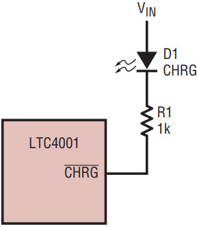 The CHRG pin indicates a variety of charger states (Table 1). Adding a resistor and LED in series with this pin to VIN (Figure 4) indicates charger off (LED off), high rate charging or cell conditioning (LED on continuously at high brightness), and battery temperature out of range/NTC fault (LED blinking).