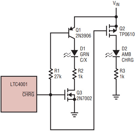 The LED also indicates when the battery is nearly full charged. As the battery approaches the float voltage and charge current drops below the IDET threshold the LED is dimly lit. This is difficult to see, so a better approach uses two LEDs to indicate all charger states (Figure 5).