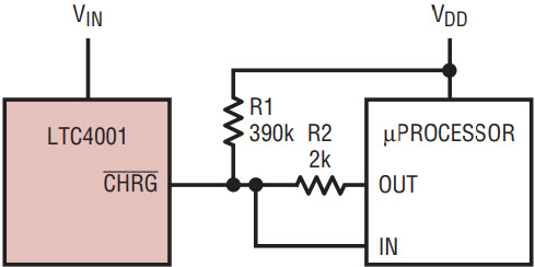 The interface in Figure 6 can distinguish between all states available on the CHRG pin. To detect cell conditioning or high rate charging, force the digital output pin, OUT, high and measure the voltage on the CHRG pin. The N-channel mosfet pulls CHRG low even with a 2k pull-up resistor. Near end of charge, the NMOS turns off, and CHRG sinks only 30µA. The IN pin is pulled high by the 2k resistor connected to OUT. If OUT is placed into a high impedance state, the 30µA sink current from the CHRG pin pulls IN low. When charging stops, CHRG opens and OUT stays high, even with a 390k pull up resistor.
