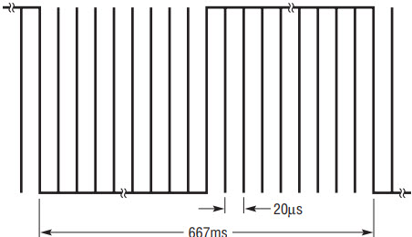 If a battery temperature fault occurs during high rate charging, the CHRG pin blinks using a serrated pulse pattern. Nominal timing of this pattern is given in Figure 7. The extra edges provide rapid indication to a microprocessor and may be used to drive a microprocessor interrupt line for low processor overhead, but still provide for a visible fault indication when using LEDs.