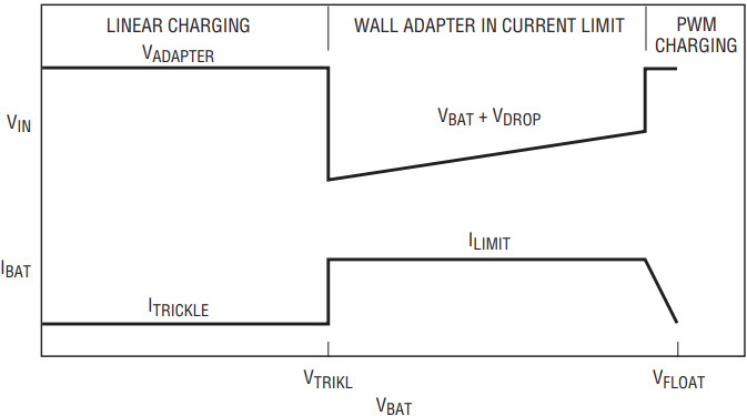 To understand operation with a current limited wall adapter, assume battery voltage VBAT is initially below VTRIKL, the trickle charge threshold (Figure 8). Battery charging begins at approximately 50mA, well below the wall adapter current limit so the voltage into the LTC4001 (VIN) is the wall adapter’s rated output voltage (VADAPTER). Battery voltage rises eventually reaching VTRIKL. The linear charger shuts off and the PWM (high rate) charger turns on using soft start. Battery charging current rises during the soft-start cycle causing a corresponding increase in wall adapter load current. When the wall adapter reaches current limit, the wall adapter output voltage collapses, and the LTC4001 PWM charger duty cycle ramps up to 100% (the top-side PMOS switch in the LTC4001 buck regulator stays on continuously.) As the battery voltage approaches VFLOAT, the float voltage error amplifier commands the PWM charger to deliver less than ILIMIT. The wall adapter exits current limit and VIN jumps back up to VADAPTER. Battery charging current continues to drop as VBAT rises, dropping to zero at VFLOAT.