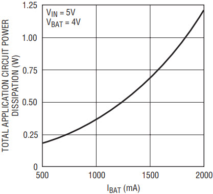So how does LTC4001 dissipation stack up against a 2A linear charger? Most of a linear charger’s dissipation occurs in the series pass element so the dissipation is approximately equal to the voltage drop in the pass element times the charge current. Worst case dissipation occurs at the lowest battery voltage where high rate charging occurs (to make a valid comparison to the LTC4001 this would be 2.85V). For a 5.0V input, this translates into a dissipation of 4.3W! Higher input voltage makes the situation even worse.