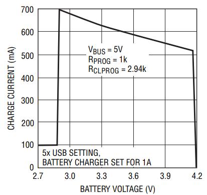 Notice that while the USB current is limited to 500mA, it’s possible for the charge current to be above 500mA due to the high efficiency of the switching PowerPath system. So not only does the higher efficiency produce little heat, but it also reduces charge time.