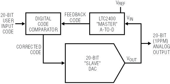 In practice, the “slave” 20-bit DAC’s output is monitored by the “master” LTC2400 A-to-D, which feeds digital information to a code comparator. The code comparator differences the user input word with the LTC2400 output, presenting a corrected code to the slave DAC. In this fashion, the slave DAC’s drifts and nonlinearity are continuously corrected by the loop to an accuracy determined by the A-to-D converter and VREF.2 No other components in the loop need to be stable.