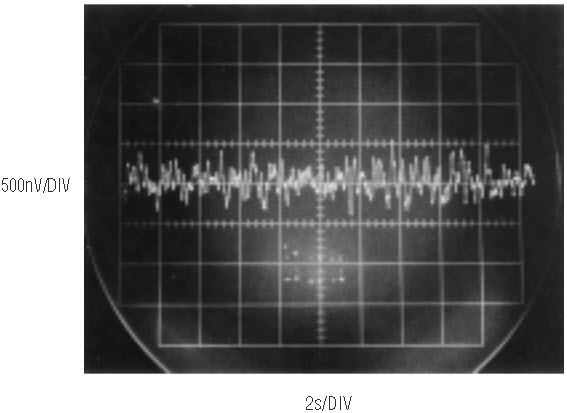 Figure 3 is a plot of linearity vs input code. The data shows linearity is within 1ppm over all codes. Output noise, measured in a 0.1Hz to 10Hz bandpass, is seen in Figure 4 to be about 0.2LSB. This measurement is somewhat corrupted by equipment limitations, which set a noise floor of about 0.2µV.