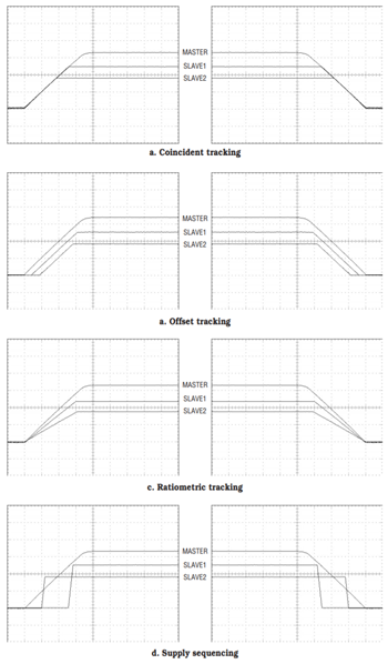 Each POL converter that must be tracked or sequenced can have a single LTC2927 placed at point-of-load as shown in Figure 1. By selecting a few resistors and a capacitor, the supplies are configured to ramp-up and ramp-down with a variety of voltage profiles. Figure 2 shows various tracking and sequencing scenarios, including concurrent voltage tracking (Figure 2a), offset tracking (Figure 2b), ratiometric tracking (Figure 2c), and supply sequencing (Figure 2d).