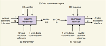 Fortunately, the model HMC6000 transmitter integrated circuit (IC) and the model HMC6001 receiver IC, both from Hittite Microwave Corp., are those practical transceiver component solutions. Hittite’s HMC6000/6001 chipset not only solves many of the key technical challenges encountered at millimeter wave frequencies, but also enables turnkey multi-Gb/s communication links at 60 GHz.