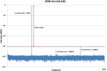 For gigasample per second (GSPS) ADCs, perhaps one of the most important ac performance specifications is SFDR. It defines the capability of the ADC and the system to decipher a carrier signal from other noise or any other spurious frequency.