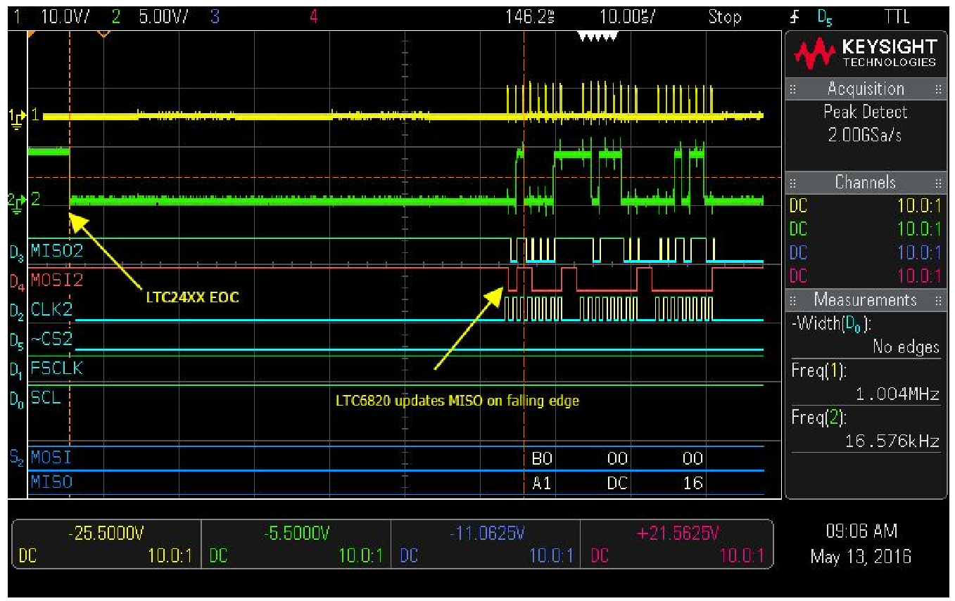 Now for the grand finale. My first test was to connect the LTC6820 to the LTC2498. The goal was to just kick the tires. I connected the Linduino to the LTC6820 and saw the waveforms shown in Figure 3. Notice that the MISO on the master LTC6820 did not update to low when the MISO on the LTC24XX changed from high to low. This may be a little strange, but as stated in the previous section this is expected behavior, the MISO on the LTC6820 master updates on the falling edge of CS or non clocking edge of the SCK.