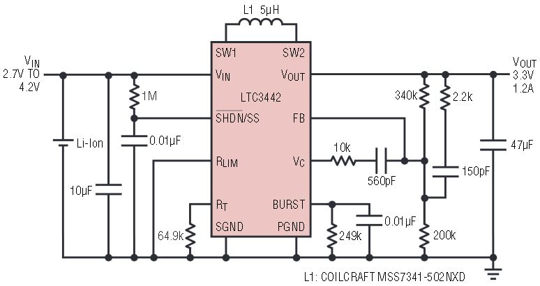Figure 1. Li-Ion to 3.3V converter delivers 1.2A with automatic Burst Mode operation.