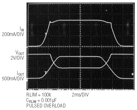 One of the restrictions placed on users of the USB bus is a maximum allowed current draw of 500mA. To guarantee that this limit is not exceeded, USB powered solutions often employ additional current limiting circuitry, increasing size and cost. The LTC3442 solves this problem by including a programmable average input current limit, which works by mirroring a small fraction of the input current and averaging it on the RLIM pin, using an external RC network. The RLIM voltage is also connected to an internal amplifier with a 1V reference. When the RLIM voltage reaches 1V, the amplifier clamps the VC pin, lowering the output voltage as needed to prevent the input current from increasing any further. In the example of Figure 4, the input current is limited to less than 500mA in the event of an overload. The current limit response time is set by the filter capacitor on the RLIM pin. Figure 7 illustrates the circuit’s response to an overload, with VOUT dropping as IOUT increases and the USB input current is clamped to 0.5A.