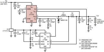 Target voltage and current limits are independently programmable. The output voltage of 7.2V, which corresponds to the charging voltage of a 3-cell lead-acid battery, is set by the R1/R2 divider and the internal reference of the LT1776. Output current, presently 200mA, is set by current sense resistor R4 and the R5/R6 divider. (A 16-pin version of the LT1620 that implements end-of-cycle detection is also available. This is useful for implementing lead-acid battery “top-off” charger behavior or the like. See the LT1620 data sheet for further information.)