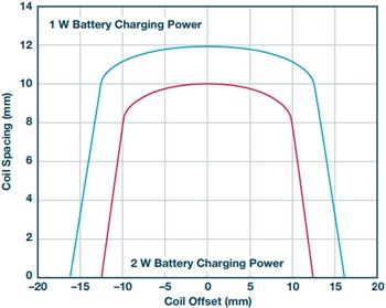 Figure 2 shows an example of a demonstration circuit with specific components. The graph shows what happens when the two coils are offset or separated by specific amounts. In a transformer, the coupling factor is usually between 0.95 and 1. In wireless power transmission systems, coupling factors of 0.8 to 0.05 are common. In Figure 2, the coil offset in millimeters is shown on the x-axis. The spacing between the two coils, also in millimeters, is shown on the y-axis. Thus, if the two coils are exactly vertically aligned (for example, the coil offset is zero) for a battery charging power of 1 W, the distance between the two coils can be up to 12 mm. The higher the power is, the closer and more precisely aligned the two coils must be. The transmittable power can be adjusted through the choice of circuit elements. However, the relationship between coil offset and coil spacing will be similar to that shown in the example.