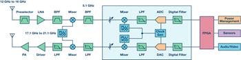 Figure 1. Traditional X- and Ku-band superheterodyne receive and transmit signal chains.