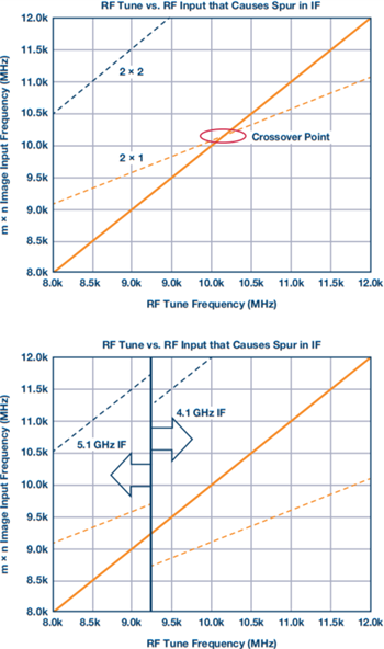 Figure 9. m × n crossover spur with no IF flexibility (top) and avoiding crossover with IF tuning (bottom).