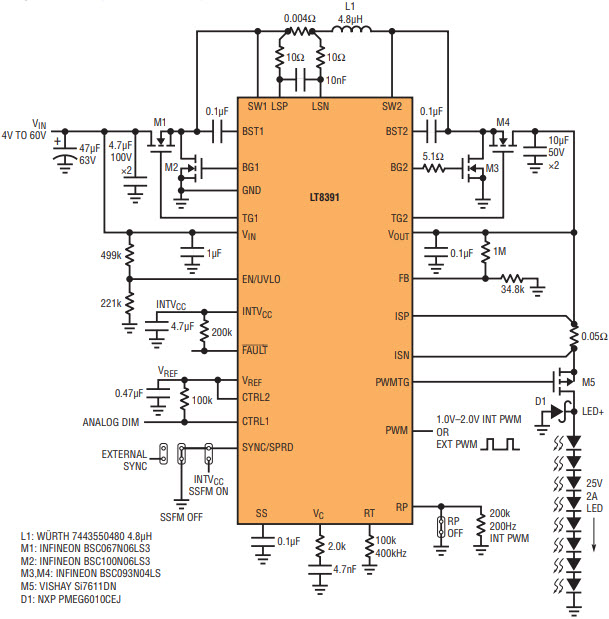 Figure 1. LT8391 4V–60V 4-switch synchronous buck-boost LED driver powers a 25V, 2A (50W) string of LEDs at up to 98% efficiency.