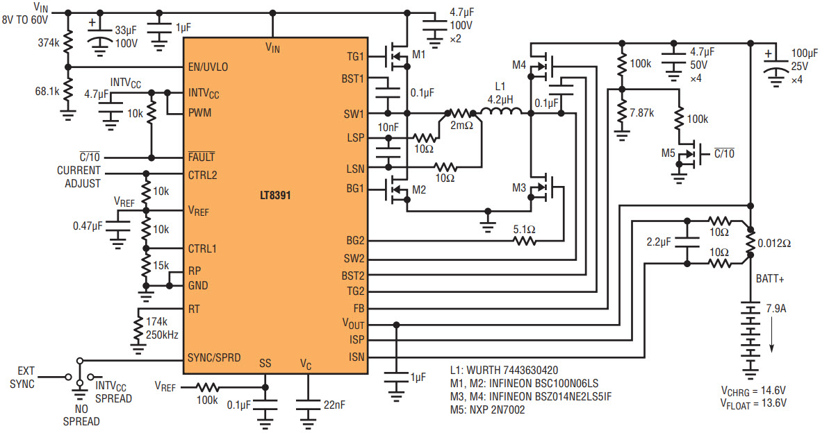 Figure 10. A 7.8A sealed lead-acid (SLA) buck-boost battery charger featuring high efficiency, four small 3mm x 3mm MOSFETs, and both charge and float voltage regulation.